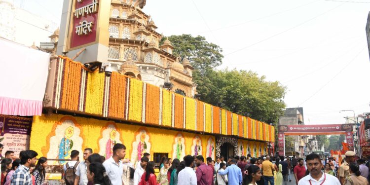 पुणे : रांगोळीच्या पायघड्या आणि फुलांची आकर्षक आरास, बँडचे मंगलध्वनी अशा मंगलमय वातावरणात दगडूशेठ हलवाई गणपती मंदिरात गुढीपाडवा साजरा करण्यात आला. श्रीमंत दगडूशेठ हलवाई सार्वजनिक गणपती ट्रस्ट, सुवर्णयुग तरुण मंडळतर्फे गणपती मंदिराच्या ४१ व्या वर्धापनदिनी गुढीपाडव्याला मंदिराच्या प्रवेशद्वारात उभारण्यात आलेल्या भव्य गुढीचे पूजन मान्यवरांच्या हस्ते करण्यात आले. पहाटेपासूनच चैत्र शुद्ध प्रतिपदेच्या दिवशी गणरायाचे दर्शन घेण्याकरीता पुणेकरांनी मोठया संख्येने गर्दी केली.